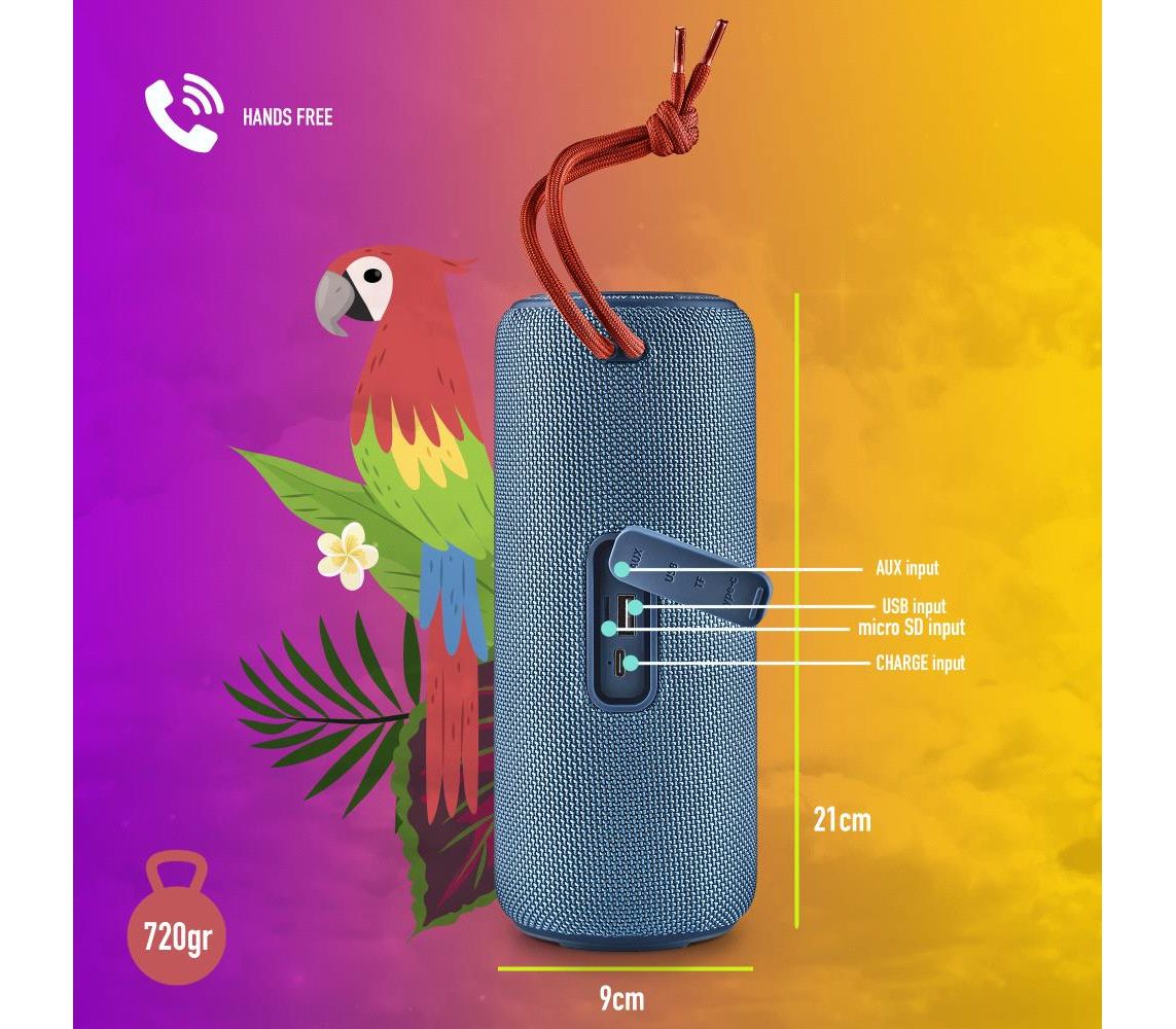 - Has FM radio, sound player via memory USB or TF and auxiliary input.